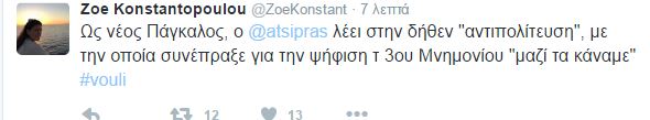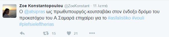 Την ομιλία του Πρωθυπουργού Αλέξη Τσίπρα, στη Βουλή για το ασφαλιστικό, σχολιάζει η επικεφαλής της Πλεύσης Ελευθερίας και πρώην Πρόεδρος της Βουλής, Ζωή Κωνσταντοπούλου με αναρτήσεις που κάνει στον προσωπικό της λογαριασμό στο Twitter.