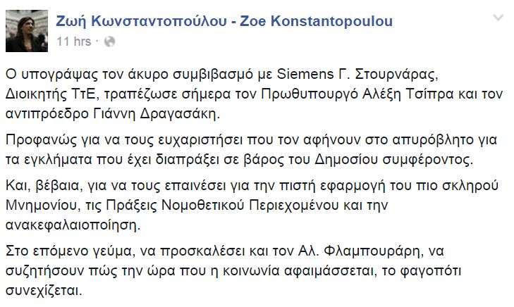 Η Ζωή Κωνσταντοπούλου έγραψε στον προσωπικό της λογαριασμό στο facebook: