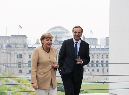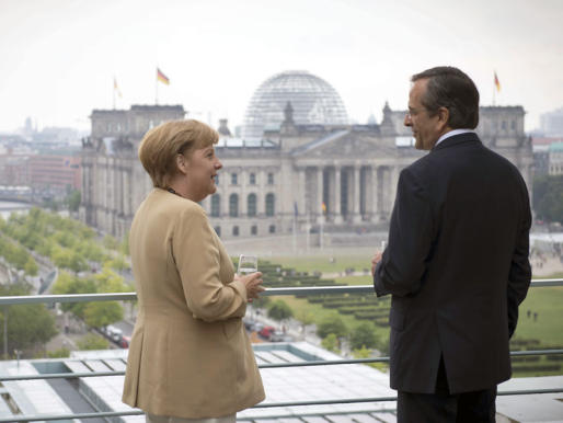 Εδώ η κ. Μέρκελ δείχνει στον κ. Σαμαρά το επιβλητικό κτίριο της γερμανικής Βουλής…