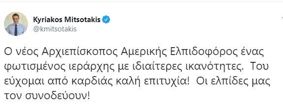 Σε ανάρτησή του στο twitter, ο πρόεδρος της ΝΔ Κυριάκος Μητσοτάκης έγραψε: «Ο νέος Αρχιεπίσκοπος Αμερικής Ελπιδοφόρος ένας φωτισμένος ιεράρχης με ιδιαίτερες ικανότητες. Του εύχομαι από καρδιάς καλή επιτυχία! Οι ελπίδες μας τον συνοδεύουν!».