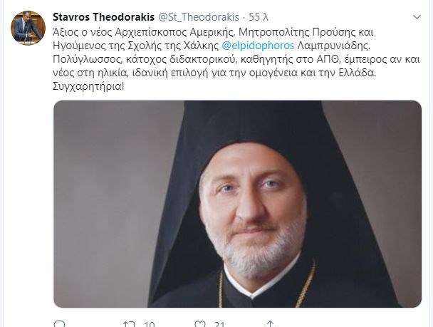 O επικεφαλής του Ποταμιού Σταύρος Θεοδωράκης επίσης με ανάρτησή του στο twitter σχολίασε: “Άξιος ο νέος Αρχιεπίσκοπος Αμερικής, Μητροπολίτης Προύσης και Ηγούμενος της Σχολής της Χάλκης Ελπιδοφόρος Λαμπρυνιάδης. Πολύγλωσσος, κάτοχος διδακτορικού, καθηγητής στο ΑΠΘ, έμπειρος αν και νέος στη ηλικία, ιδανική επιλογή για την ομογένεια και την Ελλάδα. Συγχαρητήρια!”.