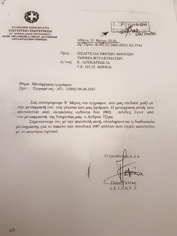 Μάλιστα, στο συγκεκριμένο έγγραφο, στις 13 Μαΐου 2016, υπήρχε και η υποσημείωση ότι με την αποστολή αυτή του δεύτερου μέρους της μετάφρασης ολοκληρωνόταν η διαδικασία για το πακέτο των συνολικά 1087 φύλλων μετάφρασης που είχαν αποσταλεί.