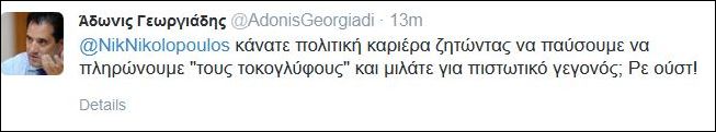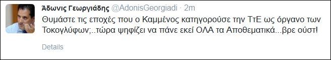 Σφοδρή επίθεση εναντίον του Πάνου Καμμένου και του Νίκου Νικολόπουλου εξαπέλυσε μέσω Twitter ο Άδωνις Γεωργιάδης με αφορμή τα αποθεματικά που θα υπαχθούν στην Τράπεζα της Ελλάδος. Ο κοινοβουλευτικός εκπρόσωπος της Νέας Δημοκρατίας εγκαλεί τον υπουργό Εθνικής Άμυνας και τον κοινοβουλευτικό εκπρόσωπο των Ανεξάρτητων Ελλήνων για το γεγονός ότι προεκλογικά κατηγορούσαν την ΤτΕ ως «όργανο των τοκογλύφων» και τώρα θέτουν υπό τον έλεγχο της τα αποθεματικά.
