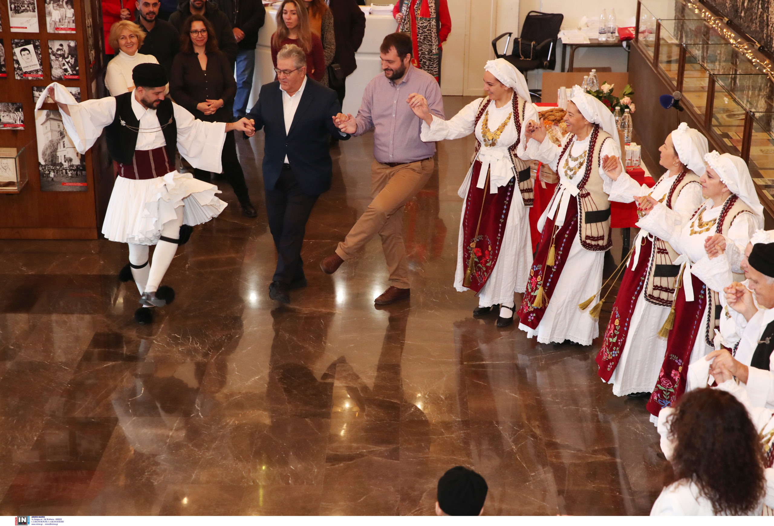 Τα πρωτοχρονιάτικα κάλαντα τραγούδησαν επίσης στον κ. Κουτσούμπα τα μέλη του Συλλόγου «Ελληνικοί Χοροί Παραδοσιακή Φλόγα», τα οποία χόρεψαν και παραδοσιακούς χορούς της πατρίδας μας.