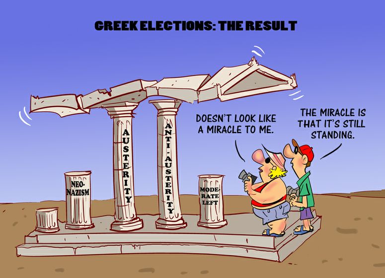 Το σκίτσο με βασικό τίτλο “Ελληνικές εκλογές: Το αποτέλεσμα” απεικονίζει τον Παρθενώνα, όπου οι κίονες αντιπροσωπεύουν κάποια από τα κόμματα που κατάφεραν να μπουν στη βουλή. Με τους δυο τουρίστες να λένε:- Δεν μου φαίνεται για θαύμα.- Το θαύμα είναι πως ακόμη αντέχει, απαντάει ο δεύτερος