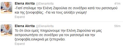 Η Ελένη Ακρίτα, μέσω, twitter σχολιάζει καυστικά την παρουσία της βουλευτή της Χρυσής Αυγής, Ελένης Ζαρούλια, στο συνέδριο του Ευρωπαϊκού Συμβουλίου κατά του ρατσισμού και της ξενοφοβίας.Διαβάστε τι έγραψε: