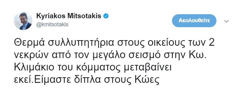 Τα θερμά του συλλυπητήρια στους οικείους των δύο νεκρών, από τον μεγάλο σεισμό στην Κω, έστειλε με ανάρτησή του στο twitter ο Κυριάκος Μητσοτάκης.