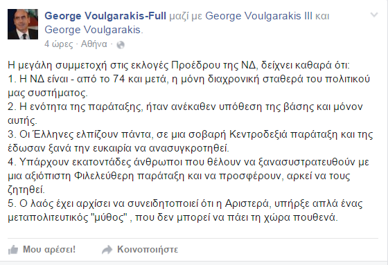 Τα αποτελέσματα των εκλογών για την ανάδειξη του Πρόεδρου της Νέας Δημοκρατίας και τη μεγάλη συμμετοχή των φίλων του κόμματος σχολίασε ο Γιώργος Βουλγαράκης με ανάρτηση του στο Facebook, επισημαίνοντας ότι οι Έλληνες ελπίζουν σε μια σοβαρή Κεντροδεξιά παράταξη και ότι ο λαός έχει αρχίσει να συνειδητοποιεί ότι η Αριστερά, υπήρξε απλά ένας μεταπολιτευτικός “μύθος”.
