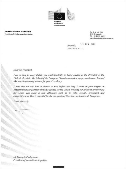 Συγχαρητήρια επιστολή προς τον Προκόπη Παυλόπουλο για την εκλογή του στην Προεδρία της Δημοκρατίας απέστειλε ο πρόεδρος της Κομισιόν, Ζαν Κλοντ Γιούνκερ.