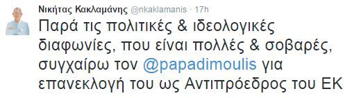 «Παρά τις πολιτικές και ιδεολογικές διαφωνίες, που είναι πολλές και σοβαρές, συγχαίρω τον @papadimoulis για επανεκλογή του ως Αντιπρόεδρος του ΕK» έγραψε ο κ. Κακλαμάνης.