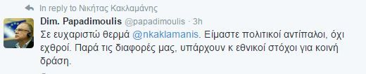 «Σε ευχαριστώ θερμά @nkaklamanis. Είμαστε πολιτικοί αντίπαλοι, όχι εχθροί. Παρά τις διαφορές μας, υπάρχουν και εθνικοί στόχοι για κοινή δράση» απάντησε ο κ. Παπαδημούλης στον λογαριασμό του στο twitter.