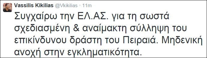 Συγχαρητήρια στην Ελληνική Αστυνομία έδωσε μέσω twitter ο υπουργός Δημόσιας Τάξης, Βασίλης Κικίλιας, για την σύλληψη του Αλβανού μακελάρη του Μικρολίμανου.