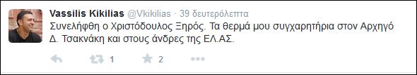 Τα συγχαρητήρια του στον Αρχηγό Δ. Τσακνάκη και στους άνδρες της ΕΛ.ΑΣ, έδωσε ο υπουργός Δημόσιας Τάξης, Βασίλης Κικίλιας μέσω του προσωπικού του λογαριασμού στο twitter, για την σύλληψη του Χριστόδουλου Ξηρού.