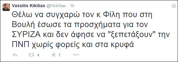 Συγχαρητήρια στον Νίκο Φίλη έδωσε ο Βασίλης Κικίλιας μέσω Twitter για τη στάση που τήρησε ο κοινοβουλευτικός εκπρόσωπος του ΣΥΡΙΖΑ κατά τη διάρκεια της συζήτησης στη Βουλή για την πράξη νομοθετικού περιεχομένου για τα αποθεματικά.