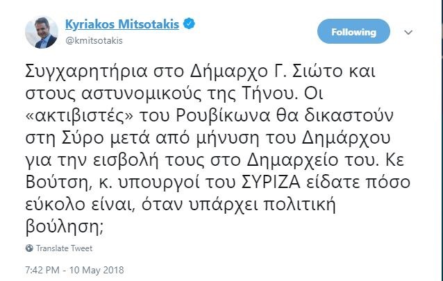 «Συγχαρητήρια στο Δήμαρχο Γ. Σιώτο και στους αστυνομικούς της Τήνου. Οι «ακτιβιστές» του Ρουβίκωνα θα δικαστούν στη Σύρο μετά από μήνυση του Δημάρχου για την εισβολή τους στο Δημαρχείο του. Κε Βούτση, κ. υπουργοί του ΣΥΡΙΖΑ είδατε πόσο εύκολο είναι, όταν υπάρχει πολιτική βούληση;», έγραψε χαρακτηριστικά ο κ. Μητσοτάκης.