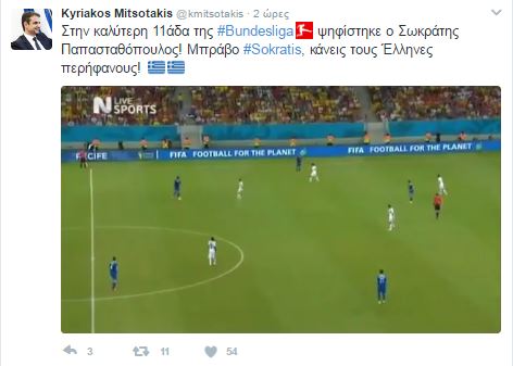 «Στην καλύτερη 11άδα της #Bundesliga ψηφίστηκε ο Σωκράτης Παπασταθόπουλος! Μπράβο #Sokratis, κάνεις τους Έλληνες περήφανους!» έγραψε ο πρόεδρος της Νέας Δημοκρατίας, συνοδεύοντας το μήνυμά του με το γκολ του Έλληνα αμυντικού κόντρα στην Κόστα Ρίκα για το Μουντιάλ του 2014.