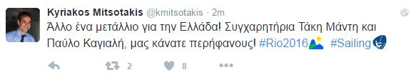 Τα συγχαρητήρια του στους χάλκινους Ολυμπιονίκες της ιστιοπλοΐας, Παναγιώτη Μάντη και Παύλο Καγιαλή, έσπευσε να στείλει μέσω του προσωπικού του λογαριασμού στο Twitter o πρόεδρος της Νέας Δημοκρατίας, Κυριάκος Μητσοτάκης.