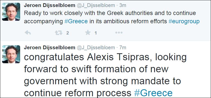«Συγχαίρω τον Αλέξη Τσίπρα και προσβλέπω στον ταχύ σχηματισμό της νέας κυβέρνησης, με ισχυρή εντολή προκειμένου να συνεχιστεί η διαδικασία μεταρρύθμισης στην Ελλάδα. Είμαι έτοιμος να συνεργαστώ στενά με τις ελληνικές αρχές και να συνεχίσουμε τις φιλόδοξες προσπάθειες μεταρρύθμισης στο Eurogroup», έγραψε ο κ. Ντάισελμπλουμ.