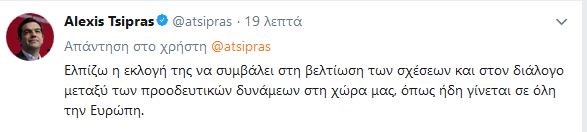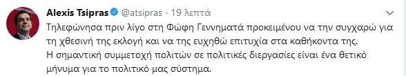 “Τηλεφώνησα πριν λίγο στη Φώφη Γεννηματά προκειμένου να την συγχαρώ για τη χθεσινή της εκλογή και να της ευχηθώ επιτυχία στα καθήκοντα της. Η σημαντική συμμετοχή πολιτών σε πολιτικές διεργασίες είναι ένα θετικό μήνυμα για το πολιτικό μας σύστημα” έγραψε ο πρωθυπουργός σε ανάρτησή του στο twitter και πρόσθεσε: