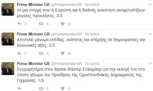 Αναλυτικά, στις διαδοχικές αναρτήσεις του ο Πρωθυπουργός αναφέρει: “Συγχαρητήρια στον Φρανκ-Βάλτερ Σταϊνμάιερ για την εκλογή του στο ύπατο αξίωμα του Προέδρου της Ομοσπονδιακής Δημοκρατίας της Γερμανίας. Αποτελεί μήνυμα ελπίδας, ενότητας και στήριξης σε δημοκρατικές και κοινωνικές αξίες, σε μια στιγμή που η Ευρώπη και η διεθνής κοινότητα αντιμετωπίζουν μεγάλες προκλήσεις”.