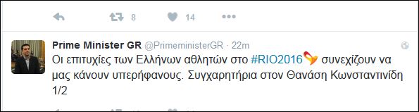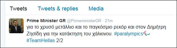 Ο Αλέξης Τσίπρας συνεχάρη μέσω του Twitter τους Θανάση Κωνσταντινίδη και Δημήτρη Ζησίδη για την κατάκτηση του χρυσού και του χάλκινου μεταλλίου, αντίστοιχα, στους Παραολυμπιακούς αγώνες του Ρίο.