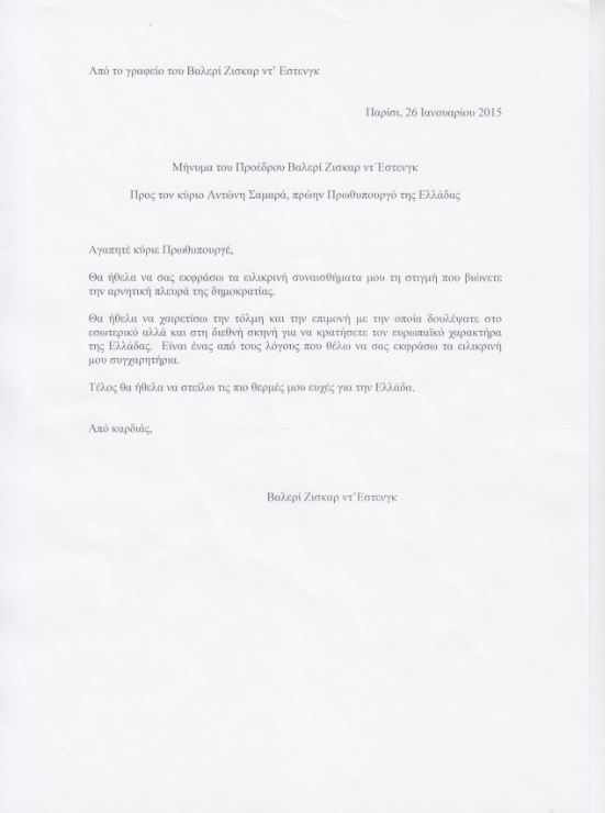 Τα συγχαρητήρια του Βαλερί Ζισκάρ Ντ’ Εστέν στον Σαμαρά