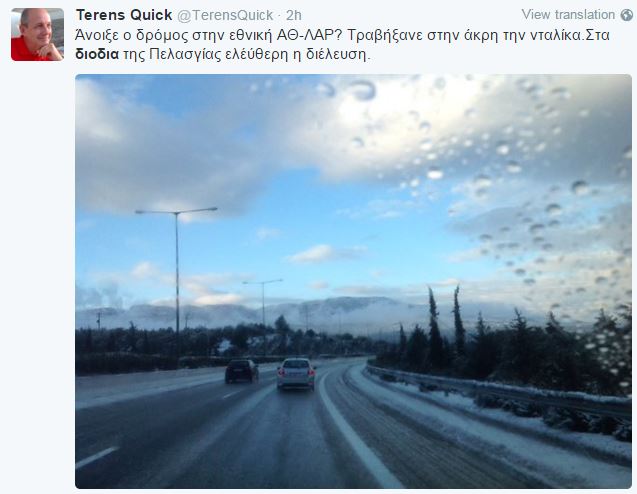 O υφυπουργός παρά τω πρωθυπουργώ, Τέρενς Κουίκ, πέρασε και αυτός με το αυτοκίνητό του από τα σημεία όπου παρουσιάστηκαν τα προβλήματα στην Εθνική οδό.