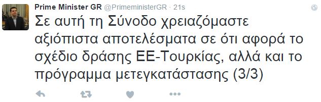 «Σε αυτή τη Σύνοδο χρειαζόμαστε αξιόπιστα αποτελέσματα σε ότι αφορά το σχέδιο δράσης ΕΕ-Τουρκίας, αλλά και το πρόγραμμα μετεγκατάστασης», πρόσθεσε.