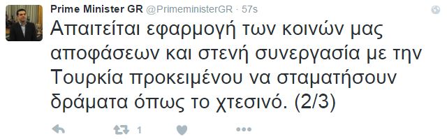 Από τον επίσημο λογαριασμό του πρωθυπουργού στο twitter, ο Αλέξης Τσίπρας έκανε αναφορά στη νέα πολύνεκρη τραγωδία στο Αιγαίο στα ανοικτά της τουρκικής λουτρόπολης Ντίντιμ, στη νοτιοδυτική Τουρκία, όπου έχασαν τη ζωή τους τουλάχιστον 25 μετανάστες και πρόσφυγες.