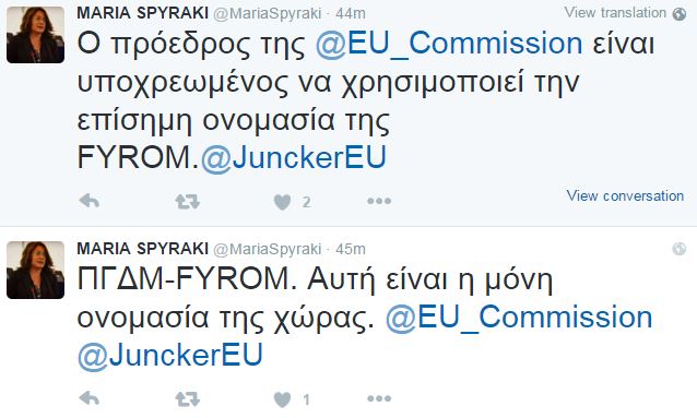 Τη διαμαρτυρία της στον Ζαν Κλοντ Γιούνκερ εκφράζει μέσω Twitter η Μαρία Σπυράκη με αφορμή, όπως λέει, την αναφορά του προέδρου της Ευρωπαϊκής Επιτροπής στην πΓΔΜ ως «Μακεδονία» .