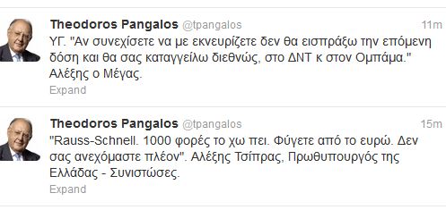 «‘Rauss-Schnell. 1000 φορές το χω πει. Φύγετε από το ευρώ. Δεν σας ανεχόμαστε πλέον’. Αλέξης Τσίπρας, Πρωθυπουργός της Ελλάδας – Συνιστώσες» και «ΥΓ. ‘Αν συνεχίσετε να με εκνευρίζετε δεν θα εισπράξω την επόμενη δόση και θα σας καταγγείλω διεθνώς, στο ΔΝΤ κ στον Ομπάμα.’ Αλέξης ο Μέγας», ήταν τα δυο Tweets που έκανε νωρίτερα ο Θεόδωρος Πάγκαλος με σαφείς αναφορές στον πρόεδρο του ΣΥΡΙΖΑ, Αλέξη Τσίπρα.