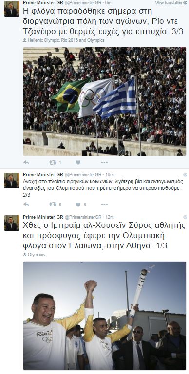 Η φλόγα παραδόθηκε σήμερα στη διοργανώτρια πόλη των αγώνων, Ρίο ντε Τζανέϊρο με θερμές ευχές για επιτυχία» έγραψε ο Αλέξης Τσίπρας.