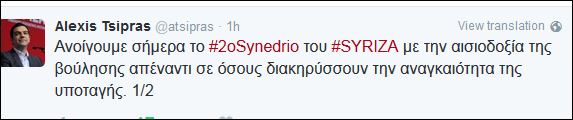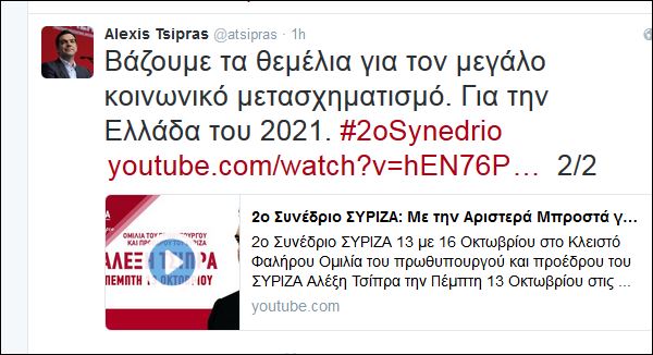 Εν αναμονή της ομιλίας του πρωθυπουργού και προέδρου του ΣΥΡΙΖΑ, με την οποία ανοίγουν οι εργασίες του 2ου Συνεδρίου του ΣΥΡΙΖΑ, ο Αλέξης Τσίπρας δίνει το στίγμα του μέσω Twitter.