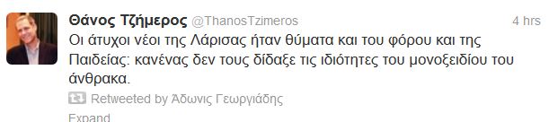 Θύελλα αντιδράσεων έχουν προκαλέσει στο Twitter τα σχόλια του Άδωνι Γεωργιάδη και του Θάνου Τζήμερου για την τραγωδία στην Λάρισα, όπου έχασαν την ζωή τους δύο φοιτητές και τρεις νοσηλεύονται στην εντατική. Αξίζει να σημειωθεί ότι ο βουλευτής της Νέας Δημοκρατίας έκανε retweet το σχόλιο του Τζήμερου που προκάλεσε σάλο, με την επισήμανση ότι κάνει retweet όχι αυτά με τα οποία συμφωνεί, αλλά όσα θεωρεί ενδιαφέροντα.