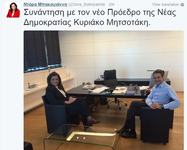 Συνάντηση με τον νέο Πρόεδρο της Νέας Δημοκρατίας, Κυριάκο Μητσοτάκη, έχει αυτή την ώρα η βουλευτής της ΝΔ, και αδελφή του, Ντόρα Μπακογιάννη, η οποία ανέβασε στον προσωπικό της λογαριασμό στο Twitter φωτογραφία από την συνάντηση τους.