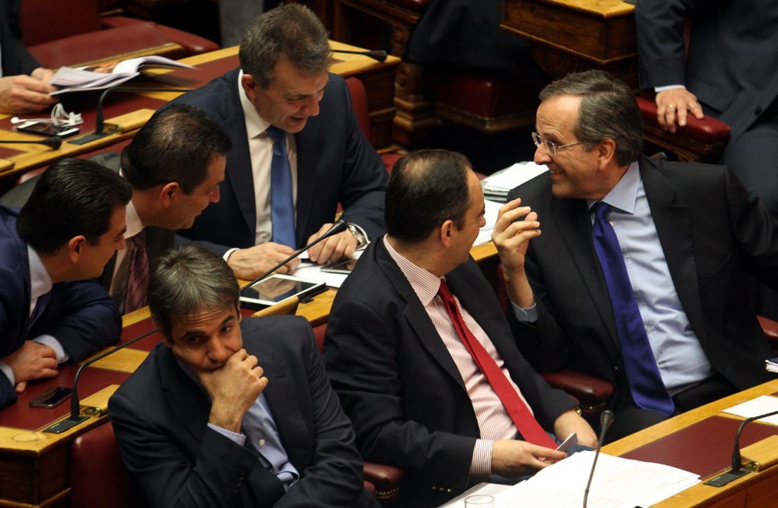 Ο πρόεδρος της Νέας Δημοκρατίας Αντώνης Σαμαράς συνομιλεί με βουλευτές στη συζήτηση για τη σύσταση εξεταστικής επιτροπής που θα διερευνήσει τις συνθήκες υπαγωγής της χώρας στα Μνημόνια. Όπως φαίνεται και στις φωτογραφίες, ο Αντώνης Σαμαράς είναι ιδιαίτερα χαμογελαστός κατά τη διάρκεια της συνομιλίας με τους βουλευτές του κόμματος του.