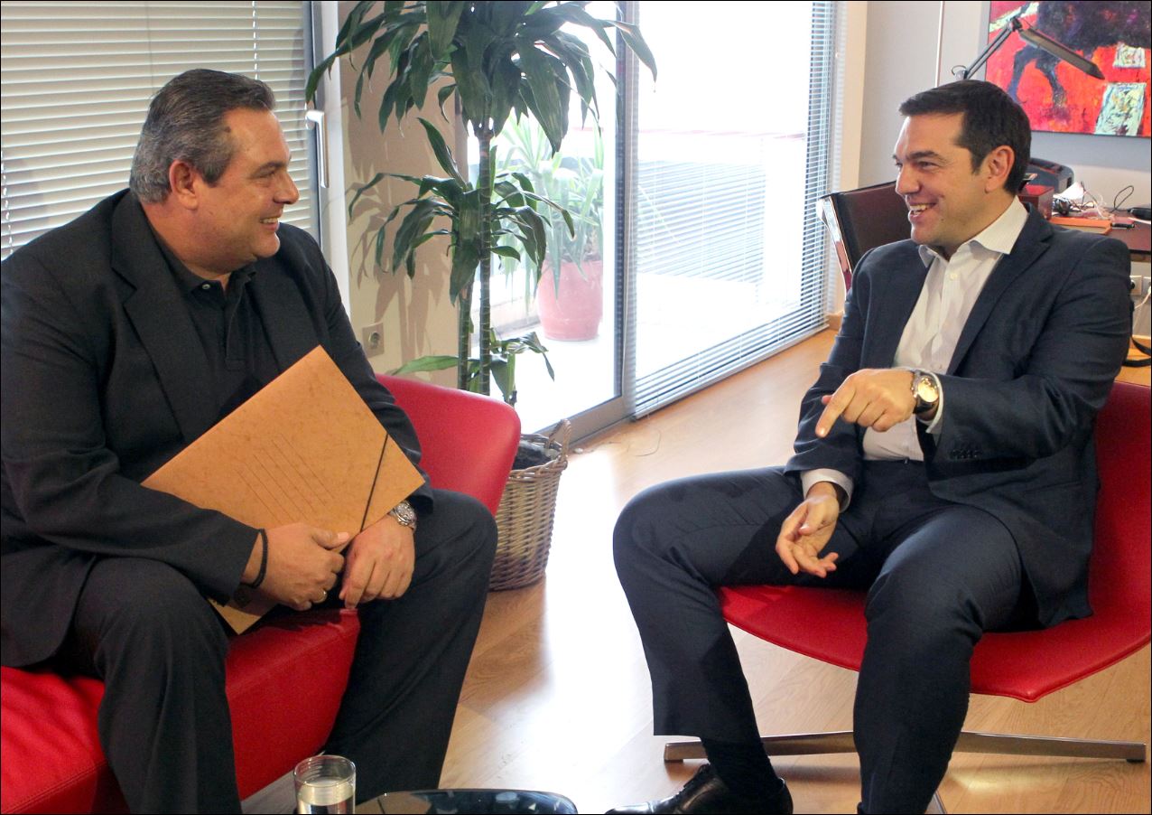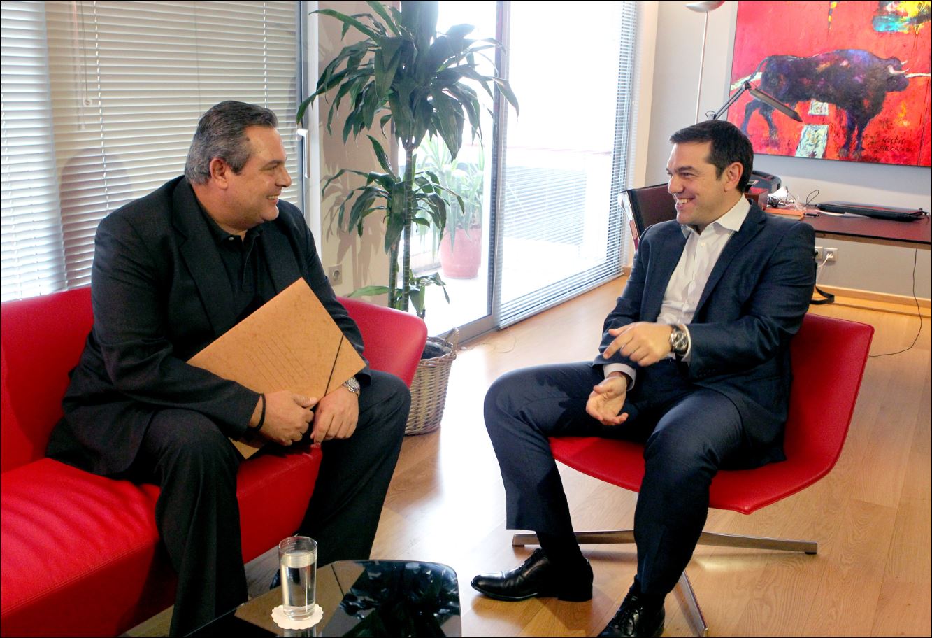 Σε πολύ καλό κλίμα πραγματοποιήθηκε η συνάντηση του Αλέξη Τσίπρα με τον Πάνο Καμμένο. Όπως είναι γνωστό οι δύο πολιτικοί αρχηγοί διατηρούν πολύ καλές σχέσεις, τις οποίες αποτύπωσε ο φωτογραφικός φακός. Ο πρόεδρος του ΣΥΡΙΖΑ και ο πρόεδρος των Ανεξάρτητων Ελλήνων έχουν αναπτύξει όλο αυτό το διάστημα της συνεργασίας τους και πολύ καλές προσωπικές σχέσεις και δεν… σταμάτησαν να χαμογελούν στη σημερινή συνάντηση.