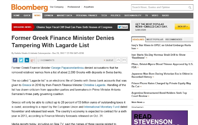 «Ο πρώην Έλληνας υπουργός Οικονομικών αρνείται την αλλοίωση της λίστας Λαγκάρντ» υπογραμμίζει μεταξύ άλλων το Bloomberg που αναφέρει ότι οι χειρισμοί Παπακωνσταντίνου συγκέντρωσαν την έντονη κριτική τόσο από τα κόμματα της αντιπολίτευσης όσο και από τον κυβερνητικό συνασπισμό του Αντώνη Σαμαρά. Παράλληλα θυμίζει και την σύλληψη του δημοσιογράφου Κώστα Βαξεβάνη για την δημοσιοποίηση της λίστας.
