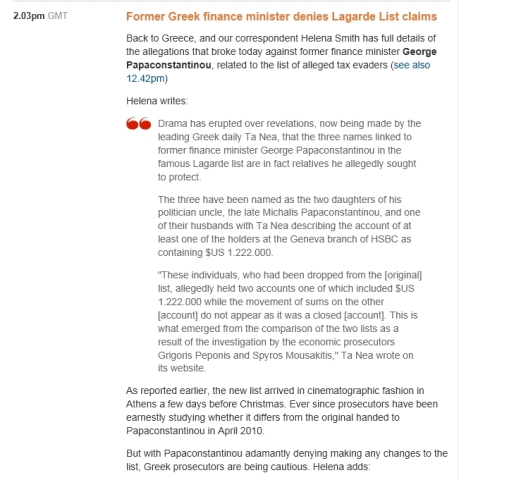 Η βρετανική εφημερίδα Guardian δημοσιεύει τις τελευταίες πληροφορίες στην λεπτό προς λεπτό μετάδοση της για τις εξελίξεις στην ευρωζώνη. Η ανταποκρίτρια της εφημερίδας στην Αθήνα τονίζει ότι ο Γιώργος Παπακωνσταντίνου αρνείται κατηγορηματικά ότι άλλαξε την λίστα Λαγκάρντ και γι’ αυτό οι δικαστικές αρχές είναι προσεκτικές. «Στο διαπεραστικό κλίμα που επικρατεί στην Ελλάδα, όπου οι εκκλήσεις για δικαιοσύνη δυναμώνουν μεταξύ του πληθυσμού που κατηγορεί σχεδόν αποκλειστικά για το οικονομικό χάος της χώρας τα λάθη των πολιτικών, οι κατήγοροι είναι επίσης προσεκτικοί απέναντι σε ένα κυνήγι μαγισσών, στο οποίο ο Παπακωνσταντίνου που έχει αρνηθεί αυστηρά οποιαδήποτε αναφορά ότι αλλοίωσε τη λίστα, θα είναι ένα εύκολο θύμα» μεταδίδει η ανταποκρίτρια.