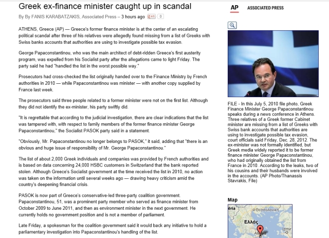«Έλληνας πρώην υπουργός Οικονομικών εν μέσω σκανδάλου» είναι ο τίτλος του ρεπορτάζ του Associated Press, που σημειώνει ότι ο Γιώργος Παπακωνσταντίνου αρνείται τις κατηγορίες. «Ο Έλληνας πρώην υπουργός Οικονομικών βρίσκεται στο επίκεντρο ενός κλιμακούμενου πολιτικού σκανδάλου αφού τρεις από τους συγγενείς του φέρονται να λείπουν από τη λίστα των Ελλήνων με καταθέσεις σε ελβετικές τράπεζες που οι αρχές χρησιμοποιούν προκειμένου να ερευνήσουν πιθανή φοροδια��υγή» γράφει, μεταξύ άλλων, το πρακτορείο ειδήσεων. Το Associated Press αναφέρει με λεπτομέρειες την πολιτική θύελλα που έχει ξεσπάσει, τη διαγραφή του πρώην υπουργού από το ΠΑΣΟΚ και τη δήλωση διάψευσης του Γιώργου Παπακωνσταντίνου περί εμπλοκής του στην υπόθεση.