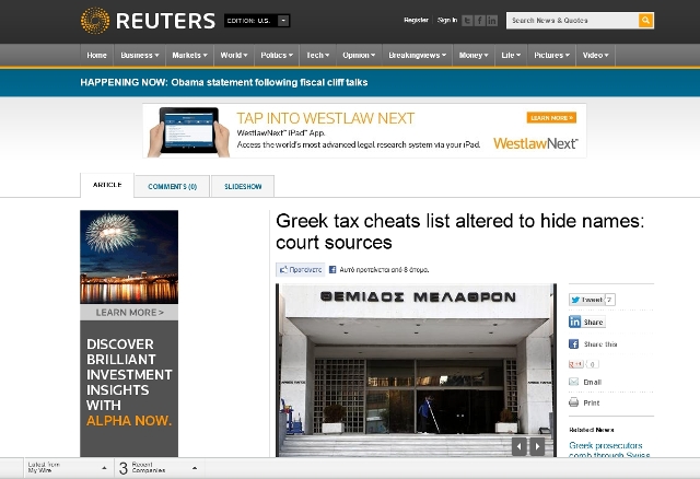 Με τίτλο «η λίστα των φοροφυγάδων τροποποιήθηκε για να κρυφτούν ονόματα» το πρακτορείο Reuters δημοσιεύει εκτενές ρεπορτάζ από τις τελευταίες εξελίξεις στην Αθήνα. Το πρακτορείο επισημαίνει ότι η ελληνική κυβέρνηση στηρίζει την έρευνα για τον πρώην υπουργό Οικονομικών Γιώργο Παπακωνσταντίνου μετά την διερεύνηση των οικονομικών εισαγγελέων, η οποία κατέληξε στο συμπέρασμα ότι έχουν σβηστεί ονόματα συγγενών του από «τη λίστα με τους πιθανούς φοροφυγάδες την οποία χειρίστηκε όσο ήταν υπουργός». «Η λίστα άλλαξε από ελληνικά χέρια» είπε ανώνυμη δικαστική πηγή στο Reuters.