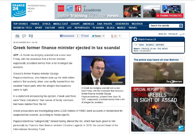 Το Γαλλικό Πρακτορείο Ειδήσεων γράφει ότι πρώην υπουργός βρίσκεται εν μέσω φορο-σκανδάλου και σημειώνει ότι «το ελληνικό σκάνδαλο φοροδιαφυγής έλαβε μία νέα τροπή την Παρασκευή με την αποκάλυψη ότι ένας πρώην υπουργός φέρεται να έσβησε ονόματα από την λίστα με τους φερόμενους φοροφυγάδες». Την είδηση αναδημοσιεύει και το γαλλικό France24.
