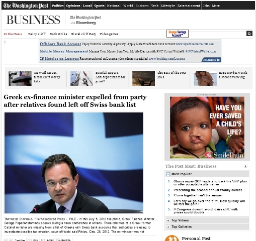 Και η Washington Post δημοσιεύει εκτενές ρεπορτάζ από την υπόθεση με τη λίστα Λαγκάρντ και φιλοξενεί αποσπάσματα της ανακοίνωσης του ΠΑΣΟΚ, το οποίο διέγραψε τον πρώην υπουργό.