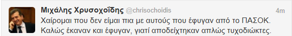 “Χαίρομαι που δεν είμαι πια με αυτούς που έφυγαν από το ΠΑΣΟΚ” γράφει, ο υποψήφιος βουλευτής του ΠΑΣΟΚ στη Β’Αθηνών, Μιχάλης Χρυσοχοΐδης, στο twitter.”Καλώς έκαναν και έφυγαν, γιατί αποδείχθηκαν απλώς τυχοδιώκτες” συμπληρώνει ο κ. Χρυσοχοΐδης, αναφερόμενος στα στελέχη του ΠΑΣΟΚ που επέλεξαν να αποχωρήσουν από το κίνημα. Δείτε το tweet: