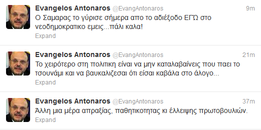 Με διαδοχικά tweets o κυβερνητικός εκπρόσωπος της κυβέρνησης Καραμανλή, Ευάγγελος Αντώναρος, επιτίθεται για ακόμη μία ημέρα στον πρόεδρο της ΝΔ Αντώνη Σαμαρά. “Ο Σαμαράς το γύρισε σήμερα από το αδιέξοδο Εγώ στο νεοδημοκρατικό εμείς…πάλι καλά!”, έγραψε στο Twitter πριν από λίγο ο κ. Αντώναρος.Λίγο νωρίτερα, είχε γράψει ότι “το χειρότερο στην πολιτική είναι να μην καταλαβαίνεις πού πάει το τσουνάμι και να βαυκαλίζεται ότι είσαι καβάλα στο άλογο..”, ενώ σχολιάζοντας την σημερινή πολιτική επικαιρότητα τόνισε: “Άλλη μία ημέρα απραξίας, παθητικότητας και έλλειψης πρωτοβουλιών”.