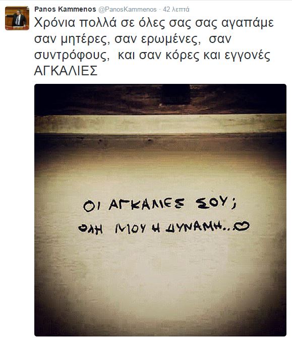 Χρόνια πολλά σε όλες τις γυναίκες ευχήθηκε μέσω του προσωπικού του λογαριασμού στο twitter ο πρόεδρος των Ανεξαρτήτων Ελλήνων και υπουργός Εθνικής Άμυνας, Πάνος Καμμένος.