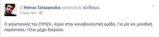 «O γελωτοποιός του ΣΥΡΙΖΑ. Αύριο στην κοινοβουλευτική ομάδα. Για μία και μοναδική παράσταση. Γέλια μέχρι δακρύων», αναφέρει συγκεκριμένα ο κ. Τατσόπουλος στον λογαριασμό του στο Facebook.