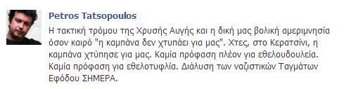 «Η τακτική τρόμου της Χρυσής Αυγής και η δική μας βολική αμεριμνησία όσον καιρό “η καμπάνα δεν χτυπάει για μας”. Χτες, στο Κερατσίνι, η καμπάνα χτύπησε για μας. Καμία πρόφαση πλέον για εθελοδουλία. Καμία πρόφαση για εθελοτυφλία. Διάλυση των ναζιστικών ταγμάτων εφόδου ΣΗΜΕΡΑ», έγραψε χαρακτηριστικά ο Π. Τατσόπουλος.
