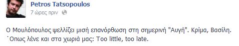 Μήνυμα στον Βασίλη Μουλόπουλο έστειλε μέσω του Facebook, ο Πέτρος Τατσόπουλος.