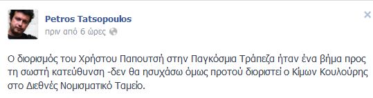 “Ο διορισμός του Χρήστου Παπουτσή στην Παγκόσμια Τράπεζα ήταν ένα βήμα προς τη σωστή κατεύθυνση -δεν θα ησυχάσω όμως προτού διοριστεί ο Κίμων Κουλούρης στο Διεθνές Νομισματικό Ταμείο”, έγραψε ο κ. Τατσόπουλος .